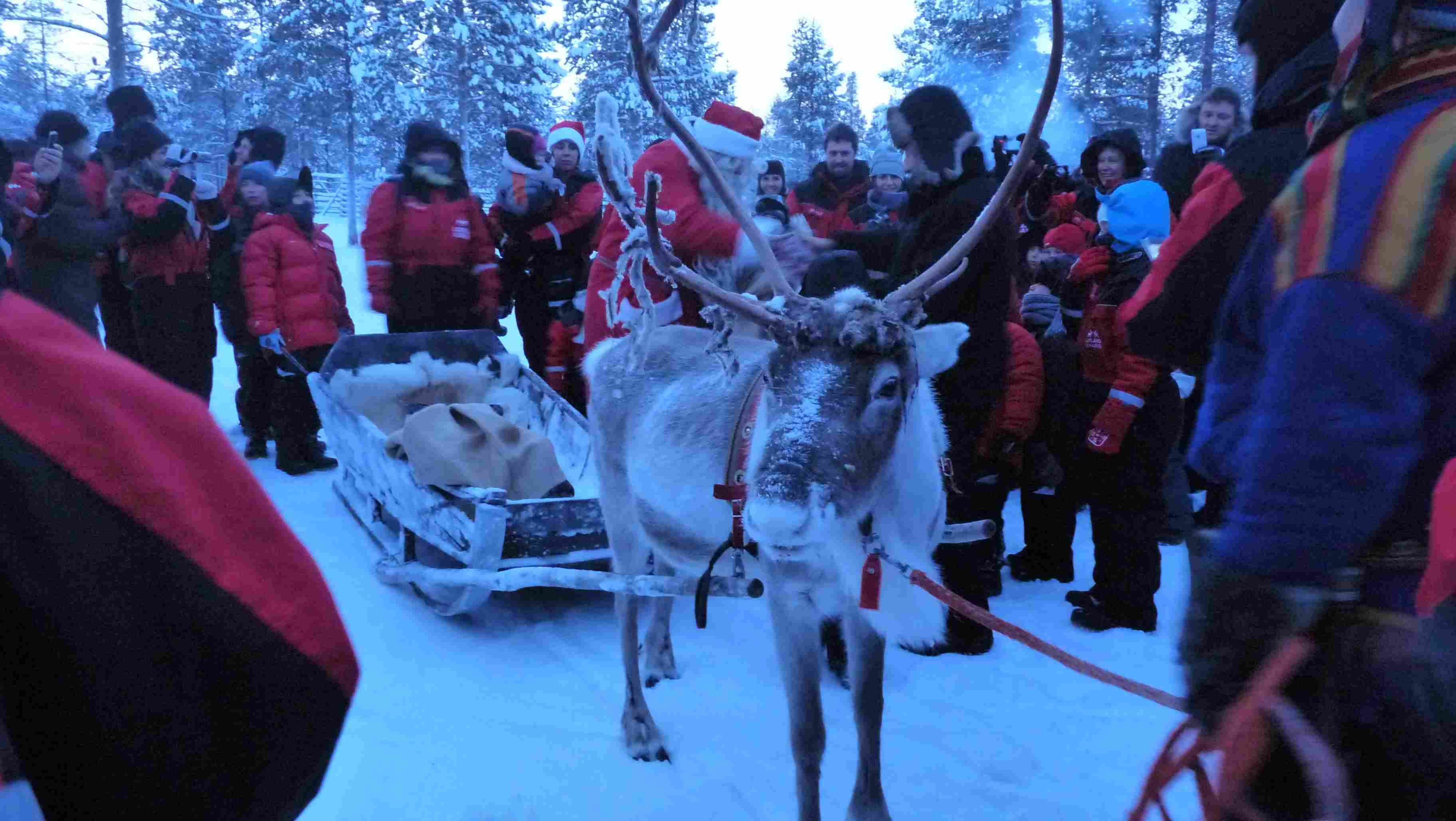 | Arrivée en traineau, comme il se doit, du héros du jour. |