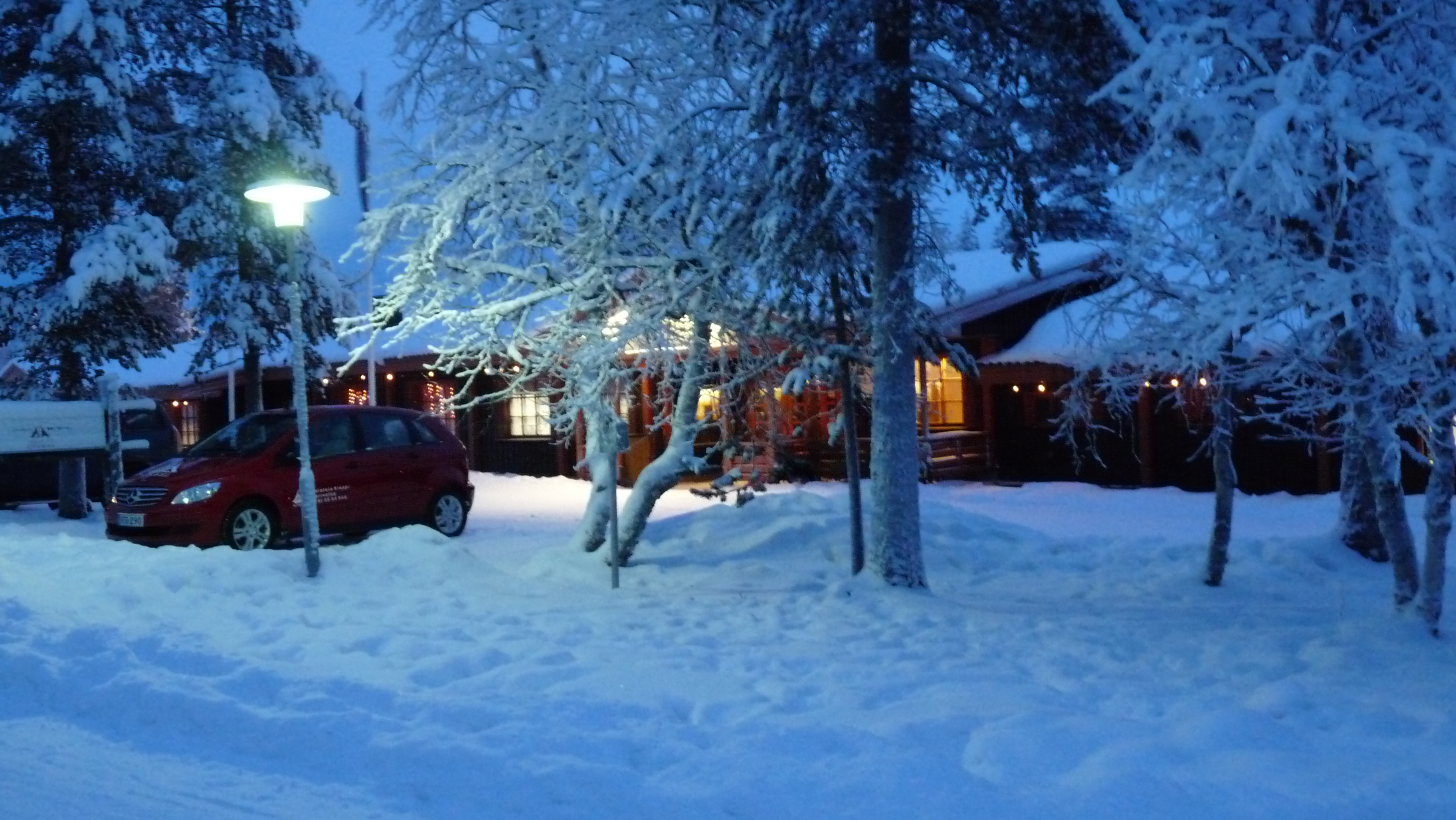 | Devant le restaurant de l'hôtel, il fait nuit; nous déjeunerons ici dorénavant |