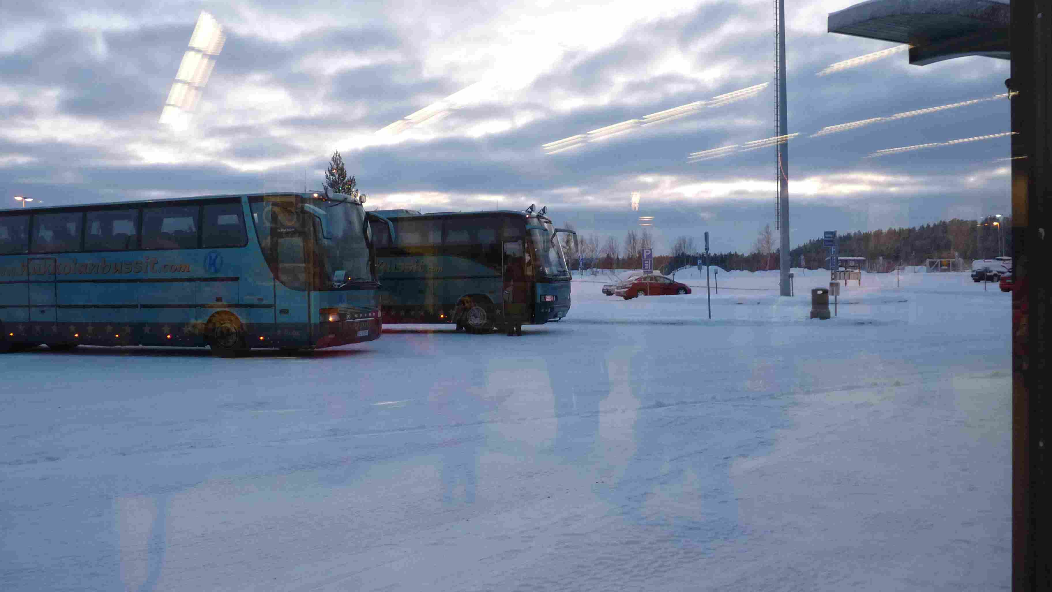 | Arrivée à l'aéroport d'Ivalo (le plus nordique des aéroports européens) - le froid nous attend dehors avec les bus |