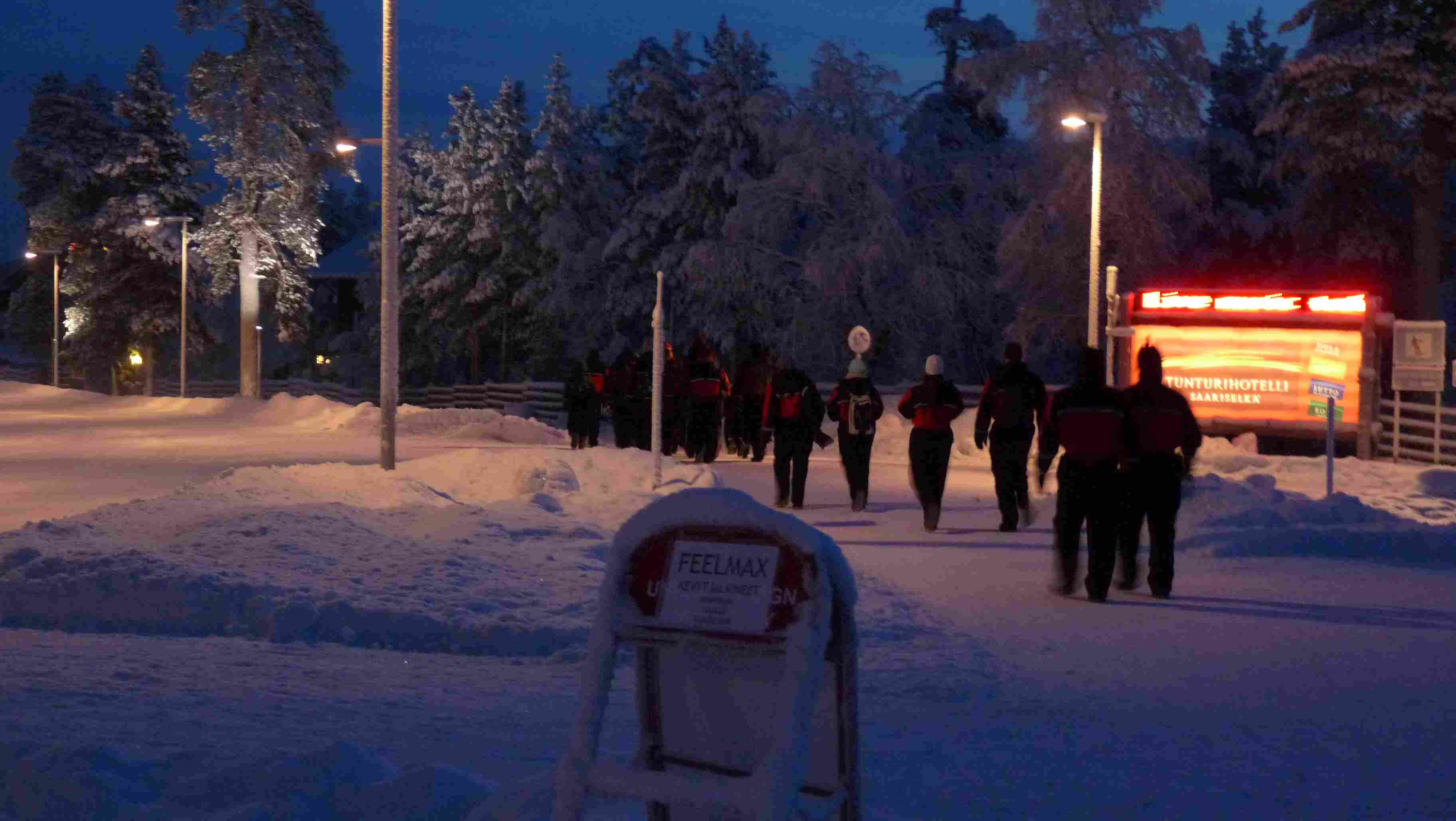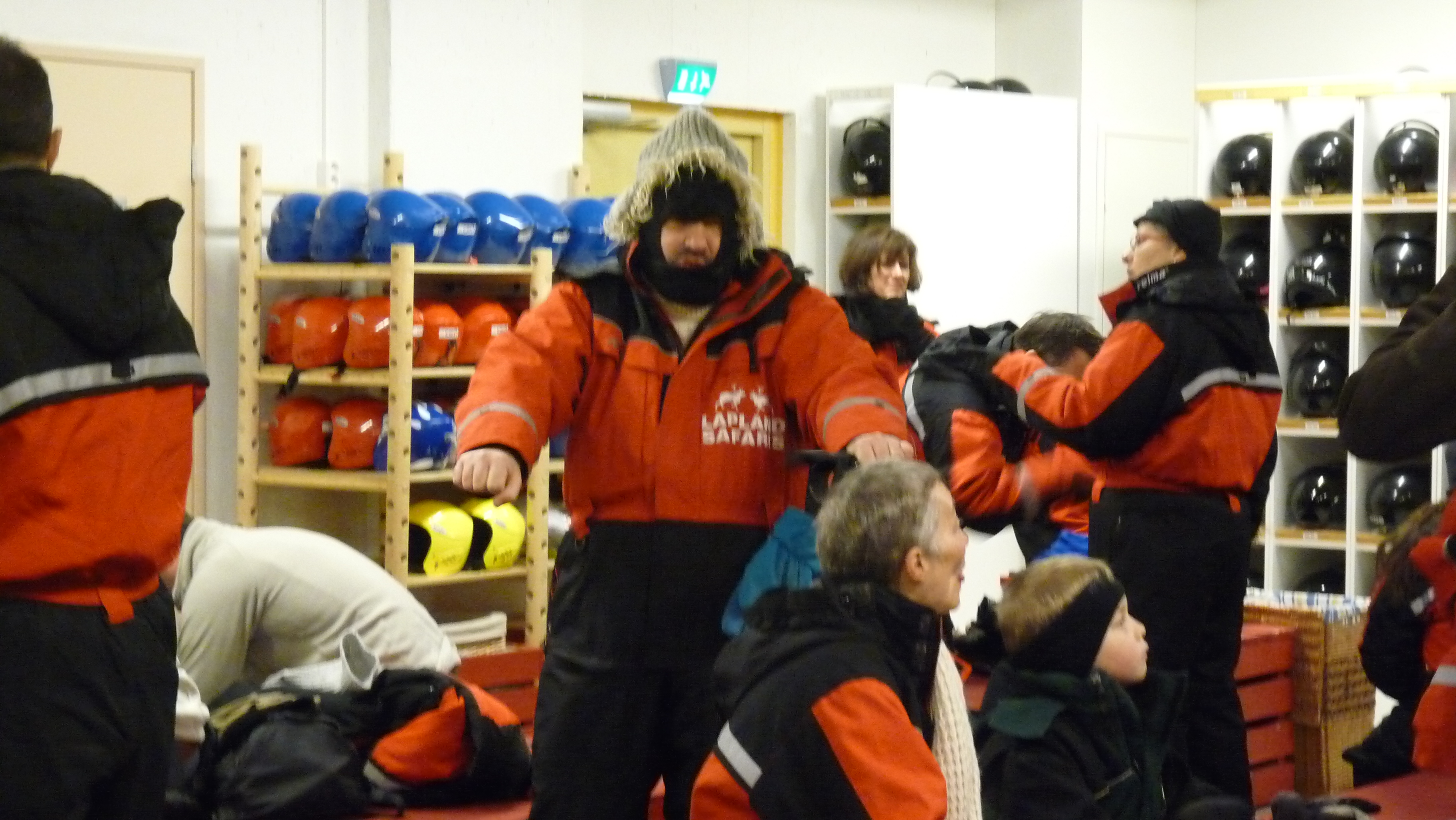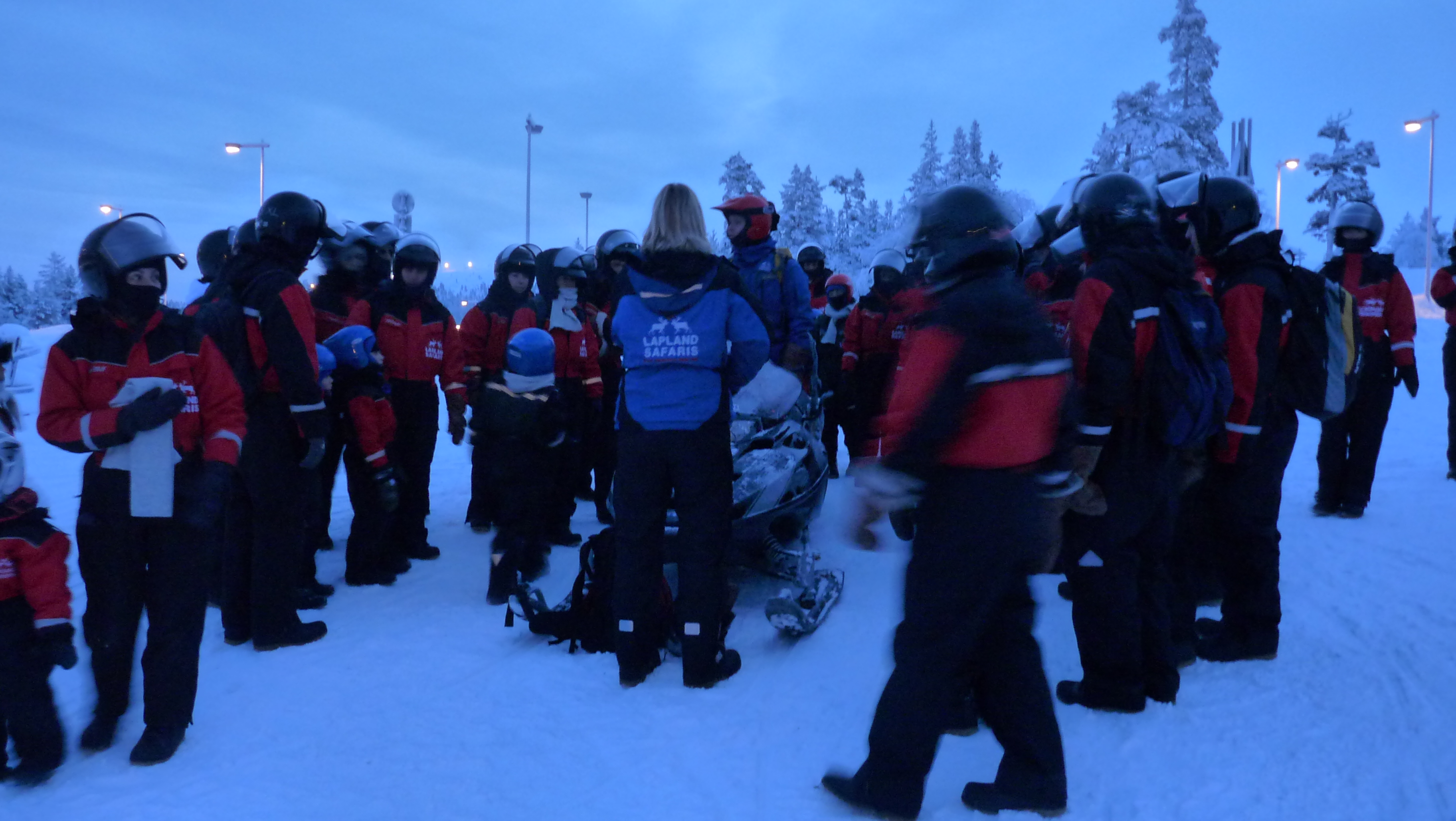 | La "troupe" s'achemine vers le magasin ou seront remis cagoules et casques pour la motoneige |